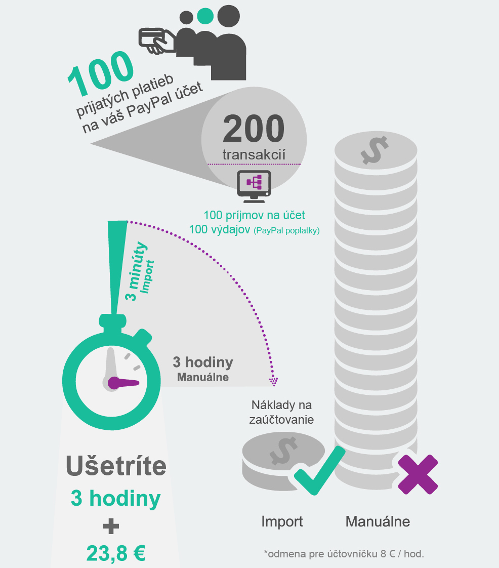 Rozdiel v zaúčtovaní 200 transakcií ručne a automatizovane môže predstavovať aj viac ako 3 hodiny. Pri hodinovej odmene 8 € pre účtovníčku to představuje úsporu 23,6 € na 100 prijatých platieb (vystavených faktúr).